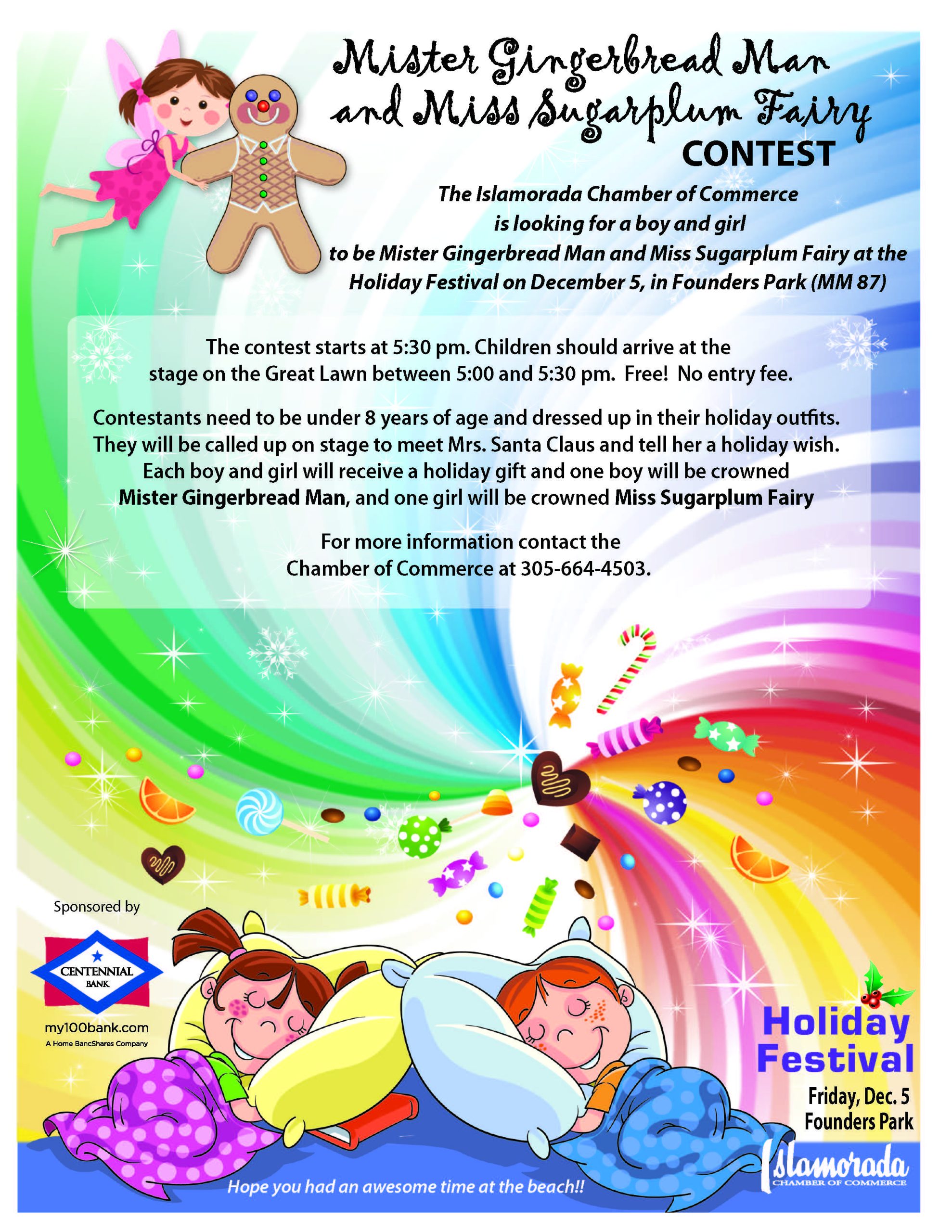 The Chamber is seeking contestants for this year’s Mister Gingerbread Man and Miss Sugarplum Fairy contest, which will take place at 5:00pm on the Great Lawn. Contestants must be under 8 years old and dressed up in their holiday outfit. They will be invited on stage to meet Mrs. Claus and tell her a holiday wish. One boy will be crowned Mister Gingerbread Man 2025 and one girl will be crowned Miss Sugarplum Fairy 2025. For more information, please contact the Chamber at 305-664-4503.