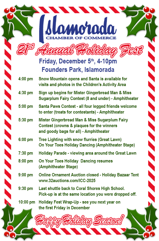For more information regarding the 2025 Islamorada Chamber Holiday Ornament Auction, please call the Chamber at 305-664-4503, email info@islamoradachamber.com, or stop by the Visitor Center at the entrance to Founders Park.