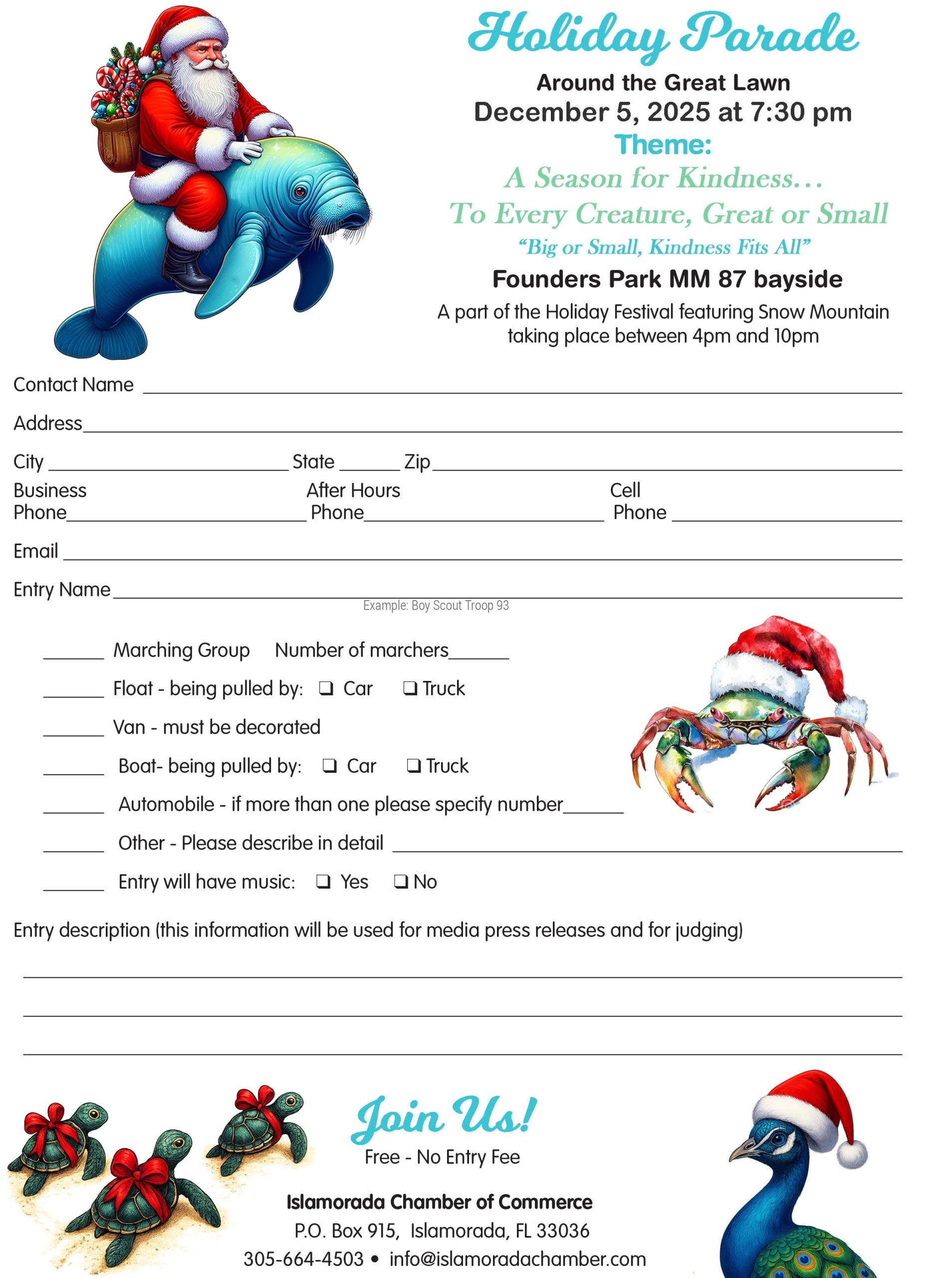 The Chamber of Commerce is seeking more entrants for the Holiday Parade. For information, or if you would like to volunteer at Holiday Fest, call 305-664-4503 or stop by the Islamorada Chamber of Commerce & Visitors Center at MM87, bayside.
